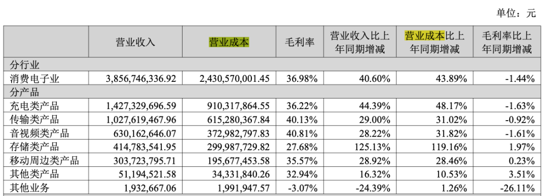 绿联科技2025半年报显示,绿联科技的营业成本从2024上半年的16.89亿元上涨至2025上半年的24.31亿元,同比增长43.89%。其中充电类产品从6.14亿元上涨到9.1亿元,同比上涨44.39%。
