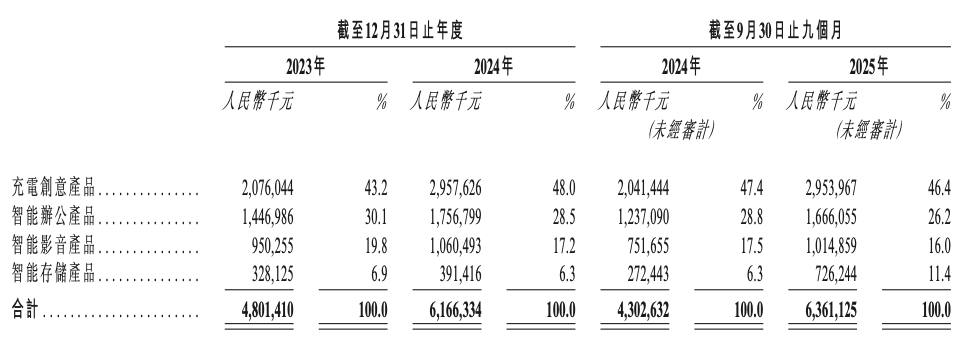 智能办公产品是公司的第二大营收板块,主要包括扩展坞、网络传输设备等,聚焦办公场景的便捷化、高效化需求,2025年前三季度实现营收16.66亿元,占总营收的26.2%,保持稳健增长态势,成为业务增长的重要支撑。