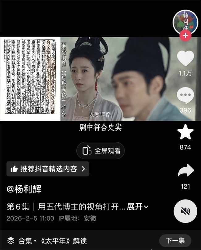 抖音历史博主@杨利辉 ,更是直接迎来了“泼天的富贵”。这哥们从2020年就开始死磕五代十国,最长的单条视频有26小时,长期不温不火,现在因为《太平年》火了,成了大家的外挂。他不光讲剧情,还拿着放大镜找细节:哪里还原了史料,哪里是编剧的“魔改”,哪里有BUG。