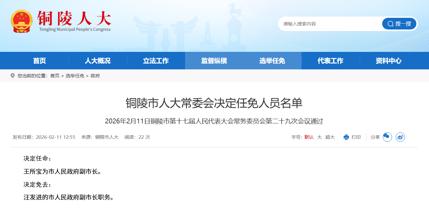 据铜陵人大官网消息,2026年2月11日铜陵市第十七届人民代表大会常务委员会第二十九次会议通过决定任免人员名单,决定任命:王所宝为市人民政府副市长;决定免去:汪发进的市人民政府副市长职务。