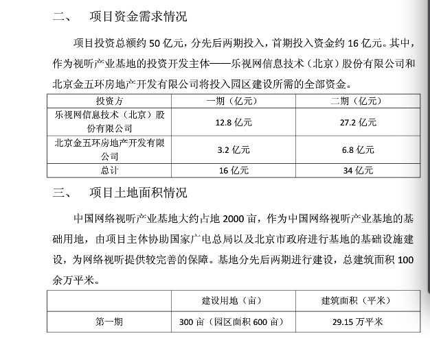 2011年,乐视网公告将在北京投资建设中国网络视听产业基地,项目一期占地600亩,二期占地1700亩,目前有326亩显示在工程招标信息中。彼时乐视表示计划在5年内全面完成园区的开发建设即2016年。但根据官方网站,2015年,乐视项目仍处于“加快前期工作”的状态。在通州商务园2016年纳税通报中,并未有此产业基地的相关信息。