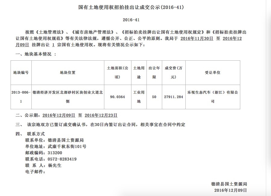 2016年12月9日乐视以2.79亿元的成交价拿下此处90万平方米工业用地。2016年12月乐视以2.79亿元的底价拿到了浙江德清的一块1350亩工业用地。根据土地出让公告,该地块受让后10个月内,必须动工建设;同时,要求自合同约定开工之日起36个月内竣工。
