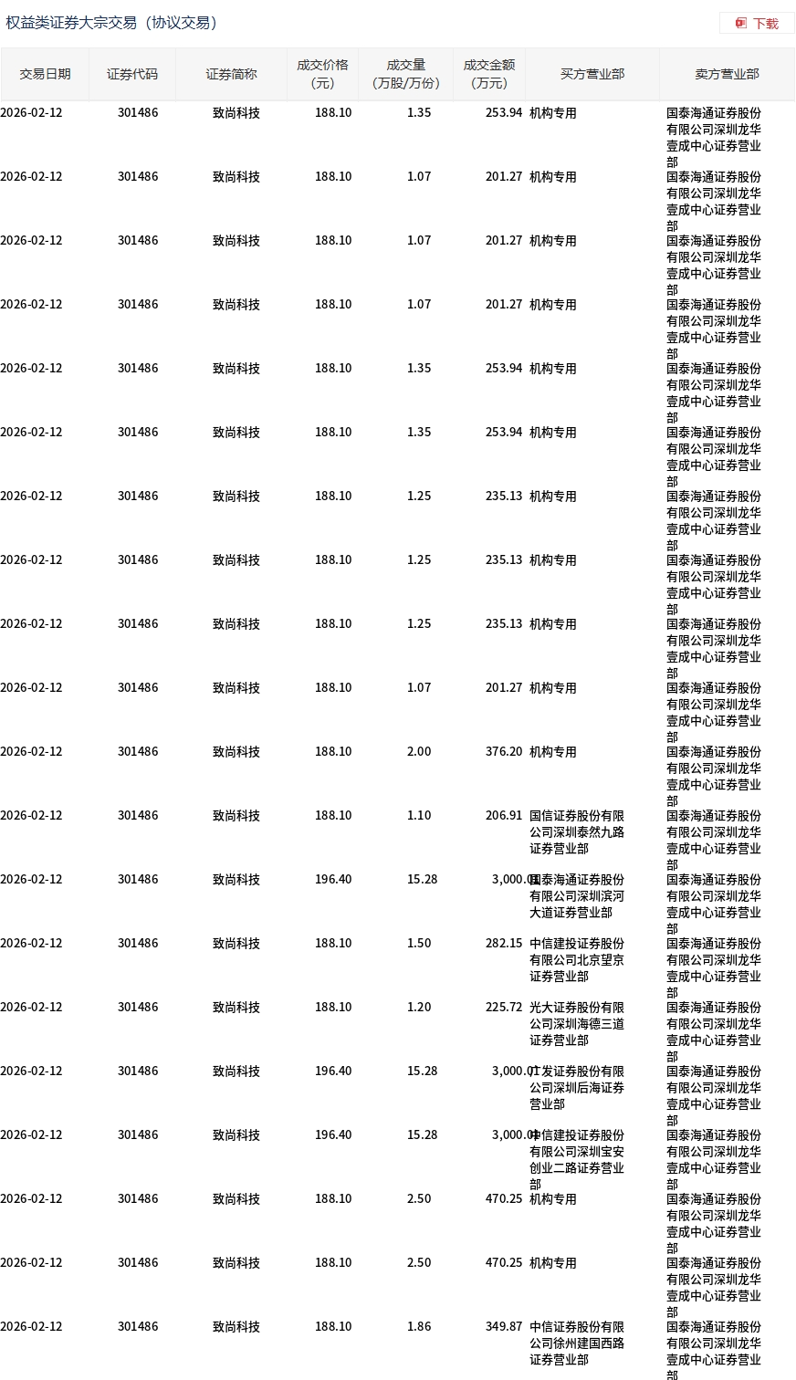 2月12日,致尚科技大宗交易成交72.9万股,成交额1.41亿元,占当日总成交额的7.3%,成交均价193.28元,较市场收盘价235元折价17.75%,其中最高成交价196.4元,最低成交价188.1元。