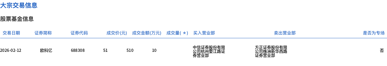2月12日,欧科亿大宗交易成交10万股,成交额510万元,占当日总成交额的1.36%,成交价51元,较市场收盘价54.25元折价5.99%。