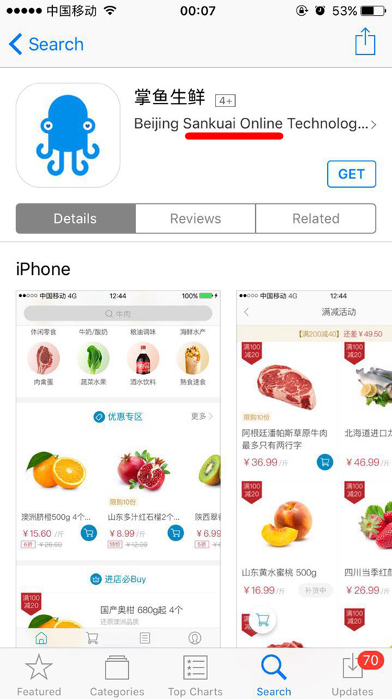 此外,有业内人士同时爆料称,新美大很快将进军线下生鲜超市——掌鱼生鲜,相关App已经进入正式运营时期。这也标志着新美大正式走入线下、线上结合的新零售领域。亿邦动力网,查询App Store中掌鱼生鲜,除显示开发商为美团母公司三快科技之外,登录App也要先成为美团用户。