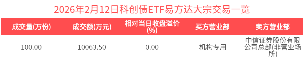 2026年2月12日,科创债ETF易方达(551500.SH)收涨0.05%,发生1笔溢价大宗交易,成交价为100.64元,较当日收盘价溢价0.00%。成交额为1.01亿元,居全市场第一。(数据来源:Wind)