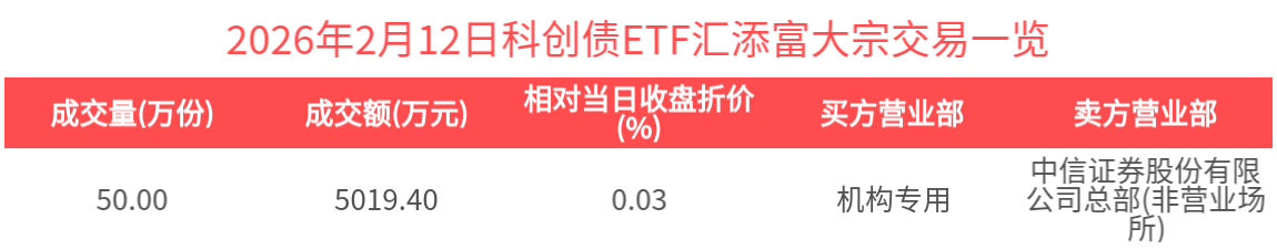 2026年2月12日,科创债ETF汇添富(551520.SH)收涨0.02%,发生1笔折价大宗交易,成交价为100.39元,较当日收盘价折价0.03%。成交额为5019.40万元,居全市场第一梯队。(数据来源:Wind)