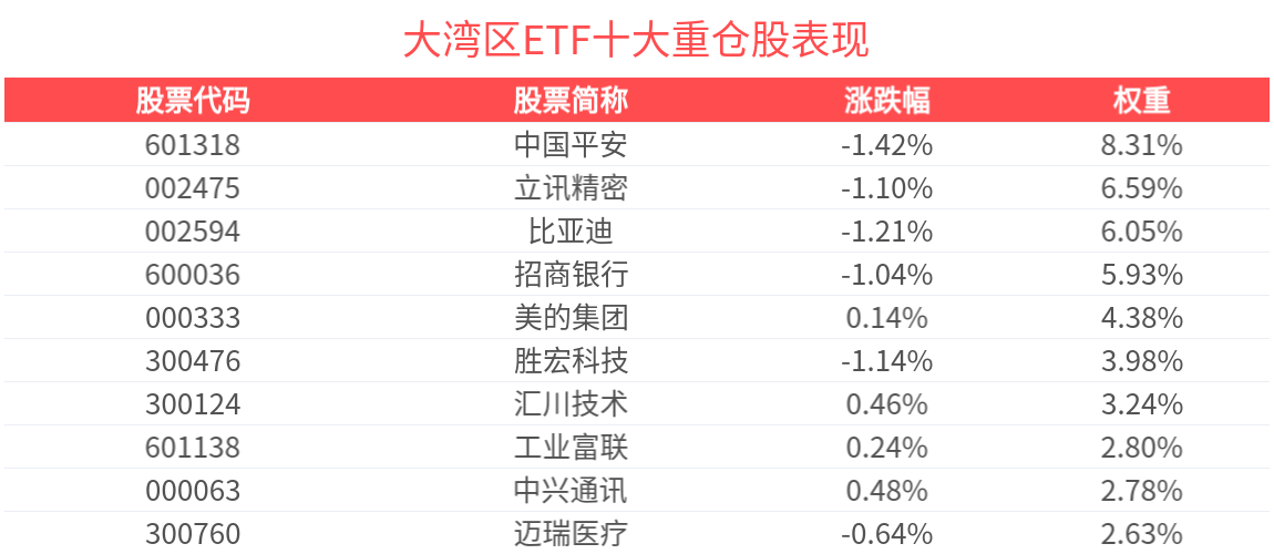 数据显示,截至2026年1月30日,中证粤港澳大湾区发展主题指数(931000)前十大权重股分别为中国平安、立讯精密、比亚迪、招商银行、美的集团、胜宏科技、汇川技术、中兴通讯、迈瑞医疗、工业富联,前十大权重股合计占比44.55%。(以上所列股票仅为指数成份股,无特定推荐之意)