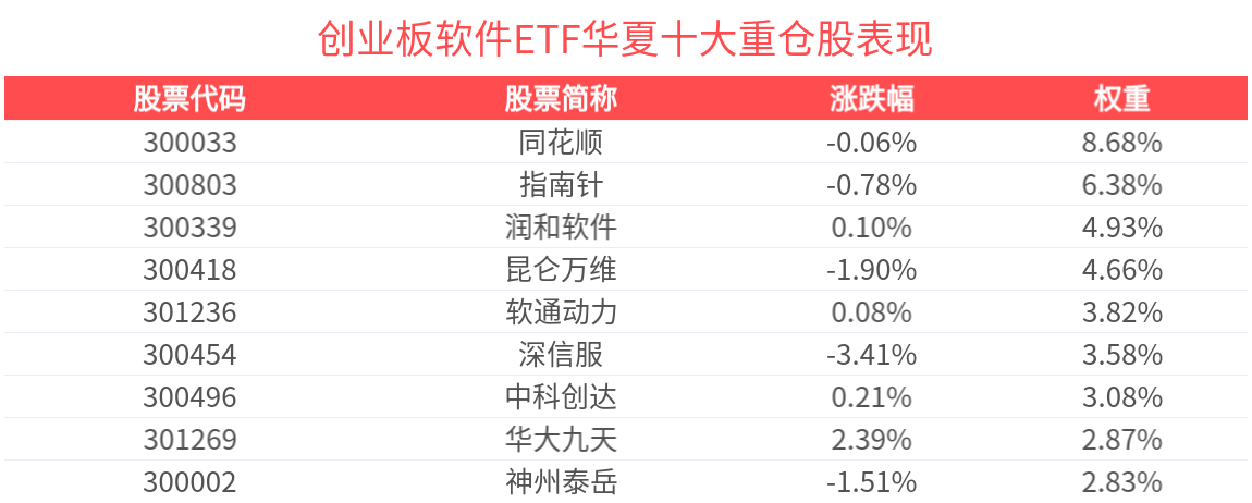创业板软件ETF华夏紧密跟踪创业板软件指数,截至2026年1月30日,创业板软件指数(399264)前十大权重股分别为同花顺、润泽科技、昆仑万维、指南针、深信服、润和软件、网宿科技、软通动力、中科创达、汉得信息,前十大权重股合计占比48.61%。(以上所列股票仅为指数成份股,无特定推荐之意)