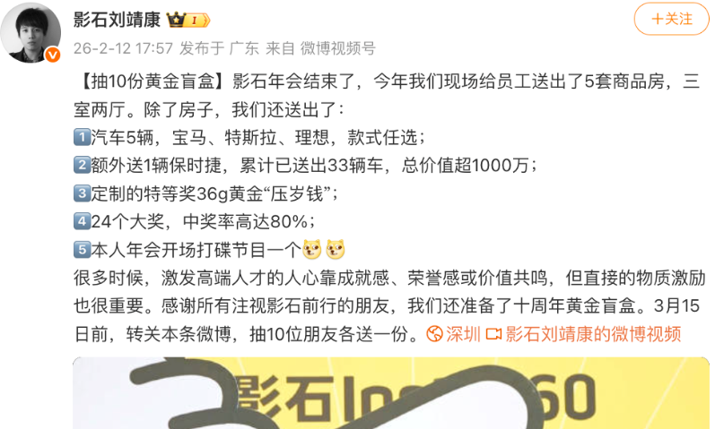 “影石年会送房送车送黄金”刷屏后,影石CEO刘靖康在次日(2月12日)下午再发“壕言”,除了送出5套三室两厅商品房,公司还送出了: