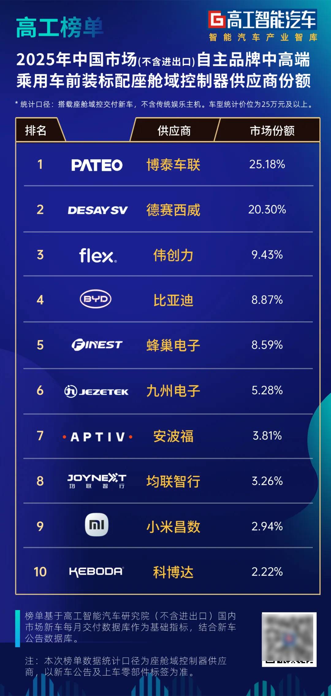 按照高工智能汽车研究院给出的最新数据显示,2025年在国内中高端价位的25万元以上自主品牌车型市场,博泰车联在座舱域控产品线以25.18%的市场份额领跑,上述价位区间每四辆车就有一辆搭载博泰车联的解决方案。