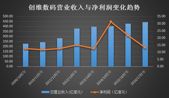 实际上,创维数码的收入并没有下降。2016/17财年,公司彩电销量1600万台,较上一年增长14.28%。营业收入428.45亿港元,同比增长0.4%。