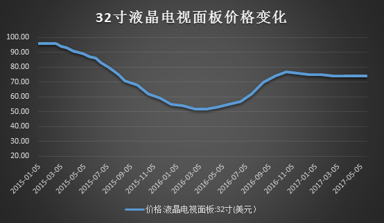 以32寸液晶电视面板价格为例,根据wind数据显示,2015年内32寸液晶面板价格降幅为74.45%,由96美元降至55美元。而在2016年10月则涨回77美元。即便是在2017年前5月回落到74美元,依旧保持在高位。