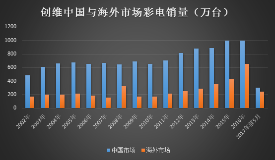 此外,创维的收入增长主要依靠海外销量大幅增加,占收入七成左右的内地销量出现下滑。内地总收入303.26亿港元,同比下跌8.5%。其中内地彩电业务收入207亿港元,下跌14.2%。 彩电销量933.9万台,同比下降约7%。