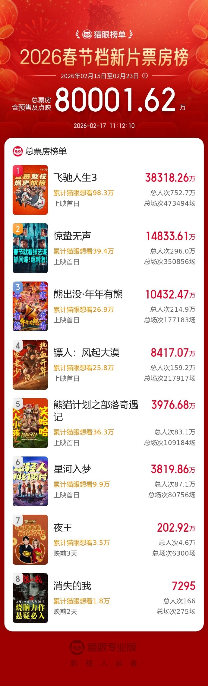 据猫眼专业版数据,2026年春节档新片总票房破8亿,《飞驰人生3》《惊蛰无声》《熊出没·年年有熊》暂列春节档新片票房榜前三位。