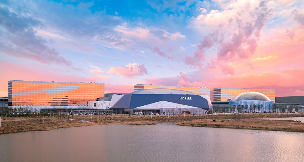 迎仕柏度假城 (INSPIRE Entertainment Resort) 坐落于韩国仁川永宗岛,毗邻仁川国际机场 2 号航站楼的国际商务中心区三期 (IBC-III),是一座集多元度假设施、娱乐元素与顶尖服务于一体的大型综合娱乐度假胜地。迎仕柏度假城完善的配套设施包括提供 1,275 间客房、风格各异的三栋五星级酒店大楼,设有 15,000 个坐席的韩国首个多功能演出场馆、多功能室内玻璃穹顶水上乐园,包含韩国最大的宴会厅的尖端会展设施,体验丰富并能容纳多达 30,000 人的大型户外欢聚公园、长 150 米且拥有巨型LED 屏的沉浸式娱乐街区,以及集购物、餐饮、创新娱乐空间于一体的商业综合体。开业仅一年时间,迎仕柏便已接待逾 400 万访客,奠定了其在韩国作为全球领先综合度假城的地位。