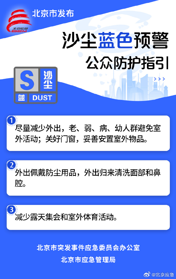 北京市气象台2026年2月21日6时00分发布沙尘蓝色预警信号:受上游沙尘输送影响,预计2月21日下午至夜间,北京市有浮尘或扬沙天气,请注意防范。