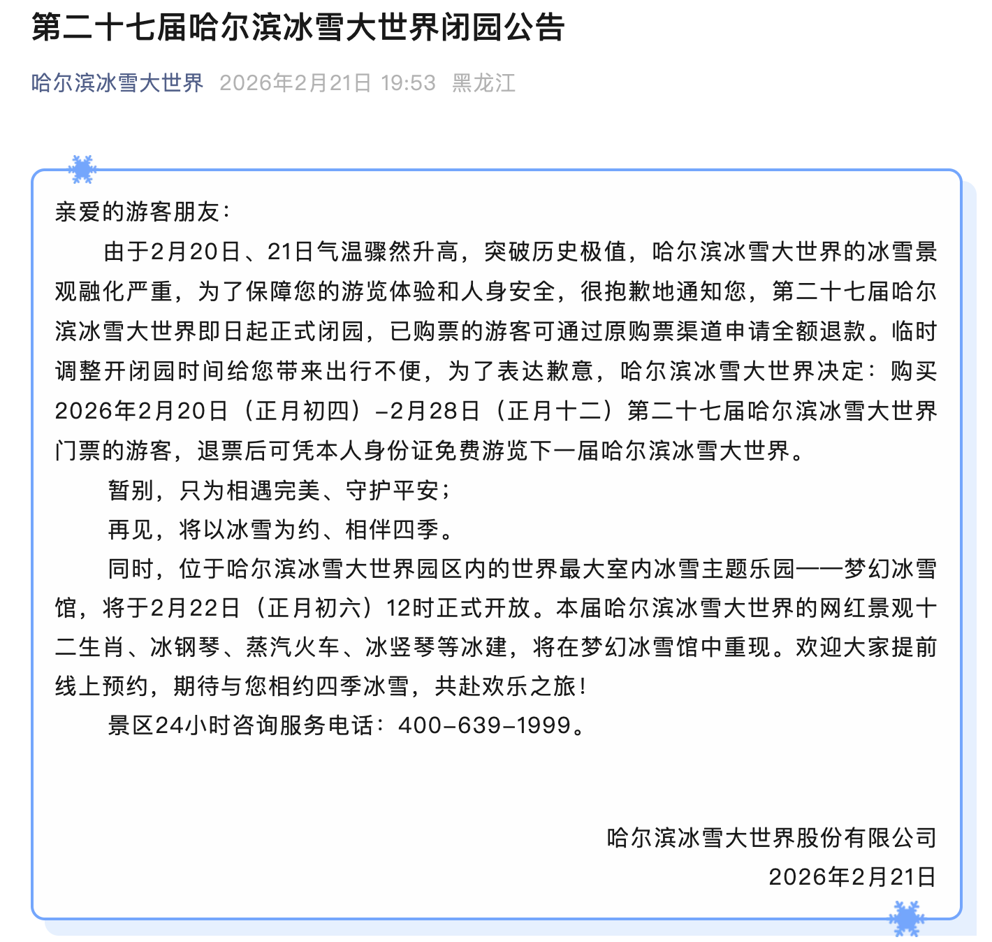 2月21日晚,哈尔滨冰雪大世界发布公告,由于2月20日、21日气温骤然升高,突破历史极值,冰雪景观融化严重,第二十七届哈尔滨冰雪大世界即日起正式闭园,已购票的游客可通过原购票渠道申请全额退款。同时,位于哈尔滨冰雪大世界园区内的世界最大室内冰雪主题乐园——梦幻冰雪馆,将于2月22日(正月初六)12时正式开放。
