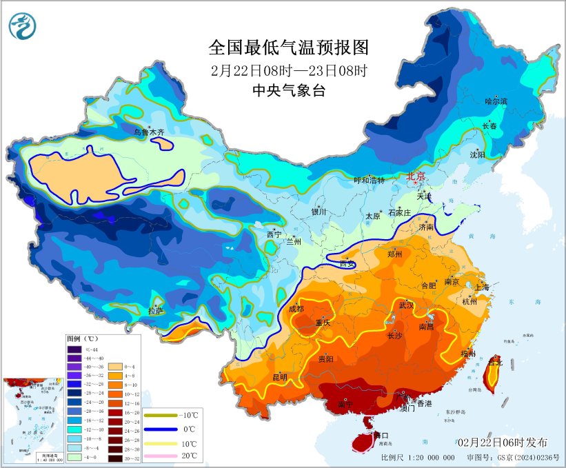 中央气象台2月22日06时继续发布寒潮蓝色预警: