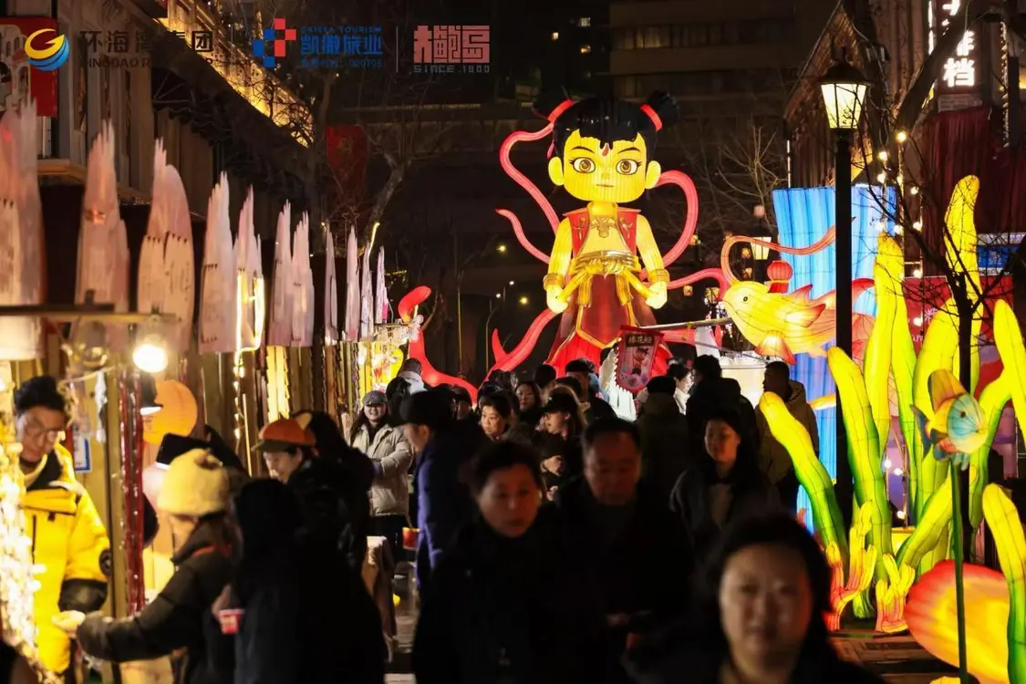 北区即墨路,15组大型艺术灯组瞬间点亮,“焰魂哪吒”手里的火尖枪在暮色中泛起红光,“云巅骏彩”的鎏金天马振翅欲飞。几乎同时,南区高密路传来“马宝鲍”IP 装置的启动音效——那匹踩着祥云的小马亮起了暖黄的肚子。而在两者之间的李村路广场,第一声电子鼓点炸响,“蹦鲍迪 2.0”的镭射光柱切开了渐暗的天空。