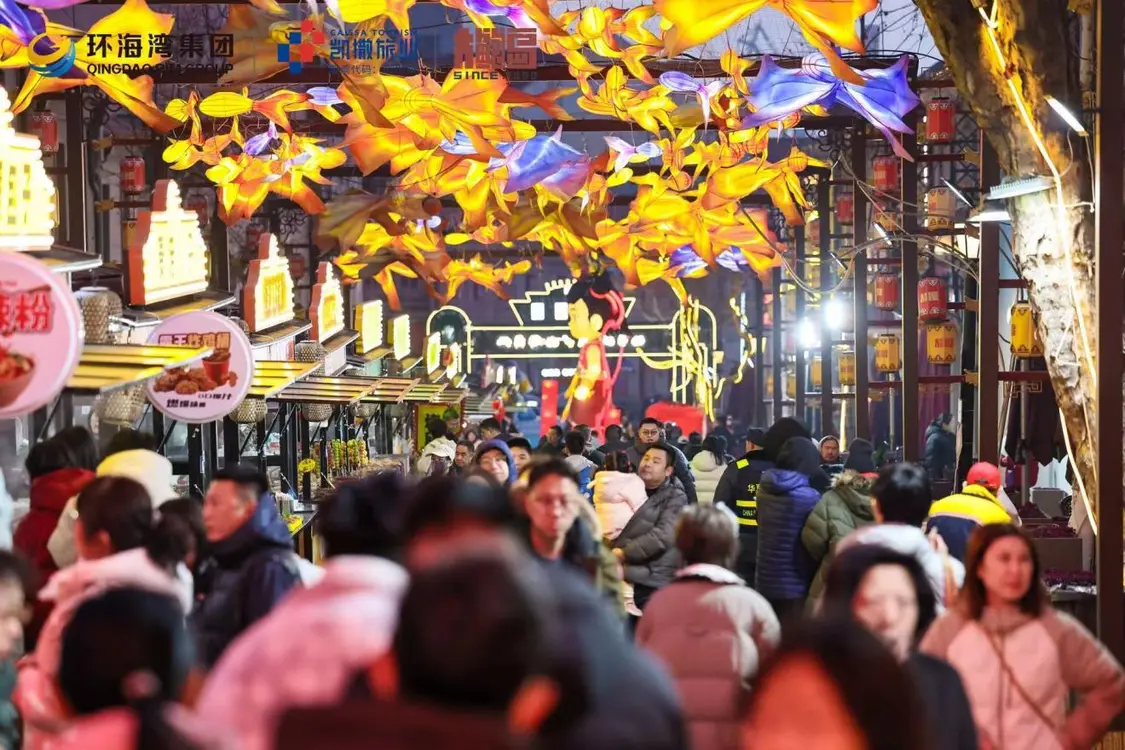 截至正月初五,糖球会大鲍岛会场(5天)累计接待游客已突破200万人次,实现销售额2000余万元,其中初四单日客流达48万人次、销售额494.4万元,创下近三年节会的新高。作为新晋国家4A级旅游景区,大鲍岛今年以“一体两翼”格局重构着青岛人的“年味时空”,而夜间的能量释放,正成为这场民俗盛会的新引擎。