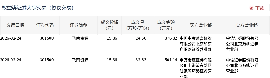 2月24日,飞南资源大宗交易成交57.13万股,成交额877.46万元,占当日总成交额的1.73%,成交价15.36元,较市场收盘价20.29元折价24.3%。