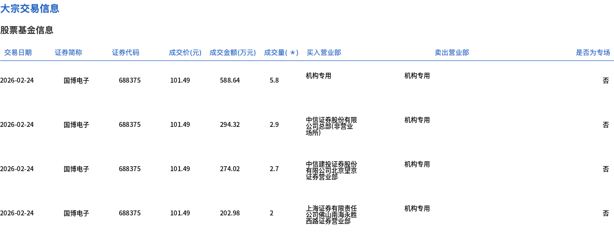 2月24日,国博电子大宗交易成交13.4万股,成交额1359.96万元,占当日总成交额的1.61%,成交价101.49元,较市场收盘价114.68元折价11.5%。