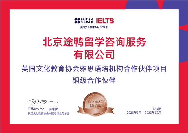 2026 年 2 月,北京途鸭留学咨询服务有限公司斩获英国文化教育协会(BC 雅思官方)雅思语培机构铜级合作伙伴认证,机构代码 TS000407,有效期为 2026 年全年。此次认证不仅是对途鸭雅思教学与服务能力的权威背书,更体现了该机构在雅思语培领域的行业竞争力,其打造的 “责任促发展,发展固责任” 模式,也为语培行业发展提供了本土样本。