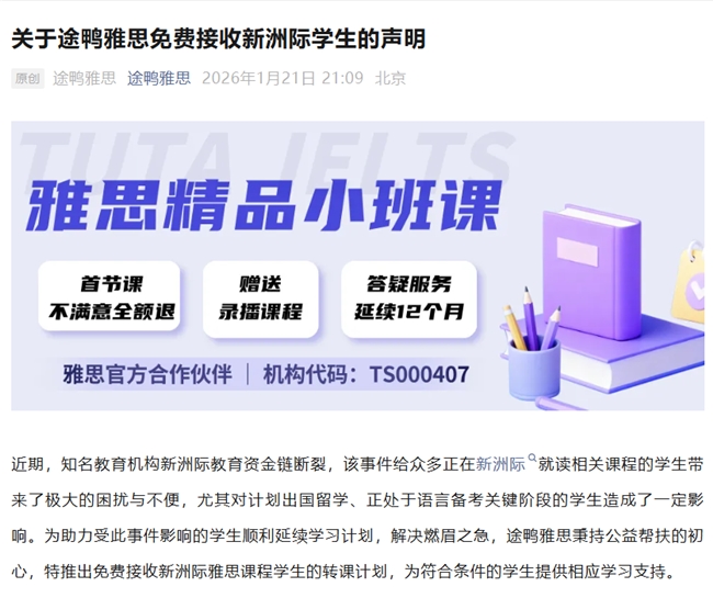 在商业发展的同时,途鸭雅思将社会责任融入品牌发展核心,成为其差异化竞争的重要抓手。2026 年初,针对新洲际教育资金链断裂引发的行业问题,途鸭雅思推出纯公益的转课计划,为受影响的学员免费提供线上雅思小班课,这一行动不仅解决了学员的实际困境,更让品牌在行业中树立了有温度、有担当的形象,凝聚了学员与家长的深层信任,也为其商业发展积累了口碑基础。