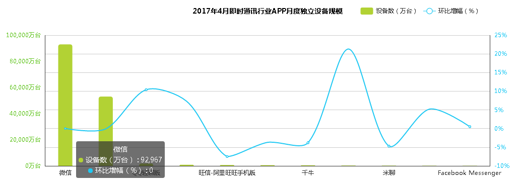 从艾瑞数据“即时通讯行业APP月度独立设备规模”图中可以明显的看到: