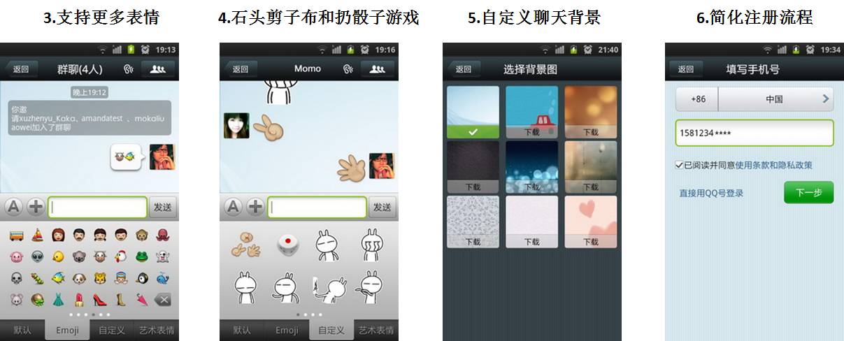 支持手机号注册,与手机通讯录匹配功能相呼应。同时,是对新用户账号注册的简化,相比QQ等账号申请需要填写一堆资料验证,手机注册只需要一条短信就全部搞定。