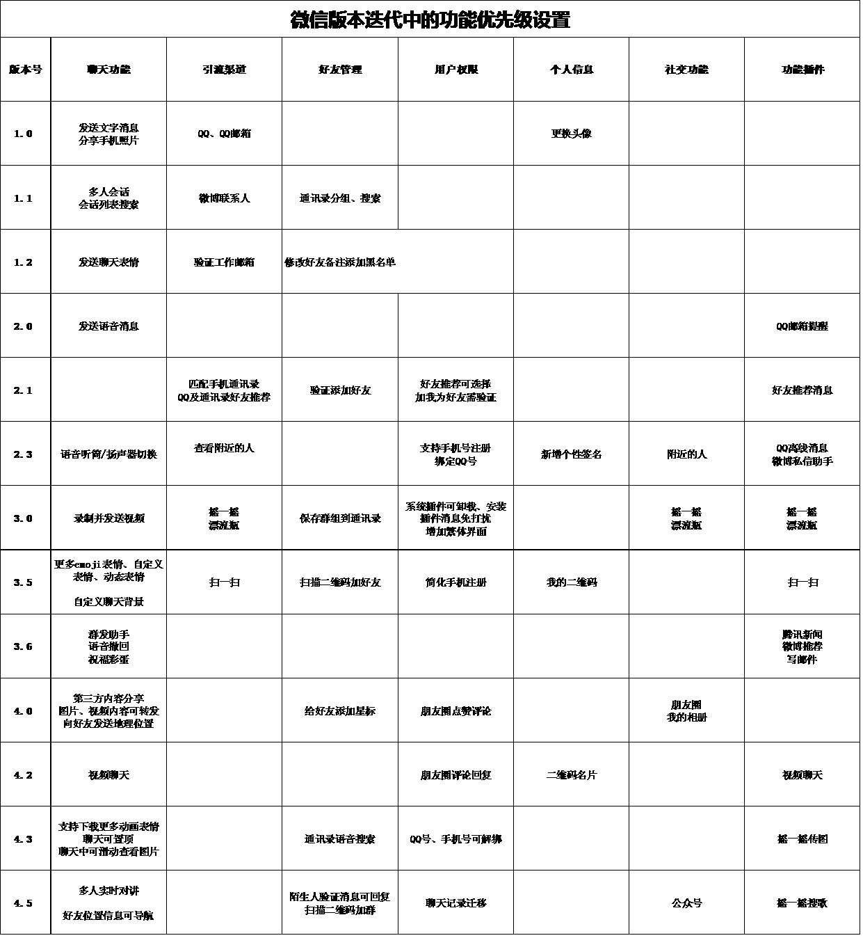 至此,微信能够在QQ成功的模板下,心无旁骛的做减法,清楚的排列功能优先级,一点一点的添砖加瓦。