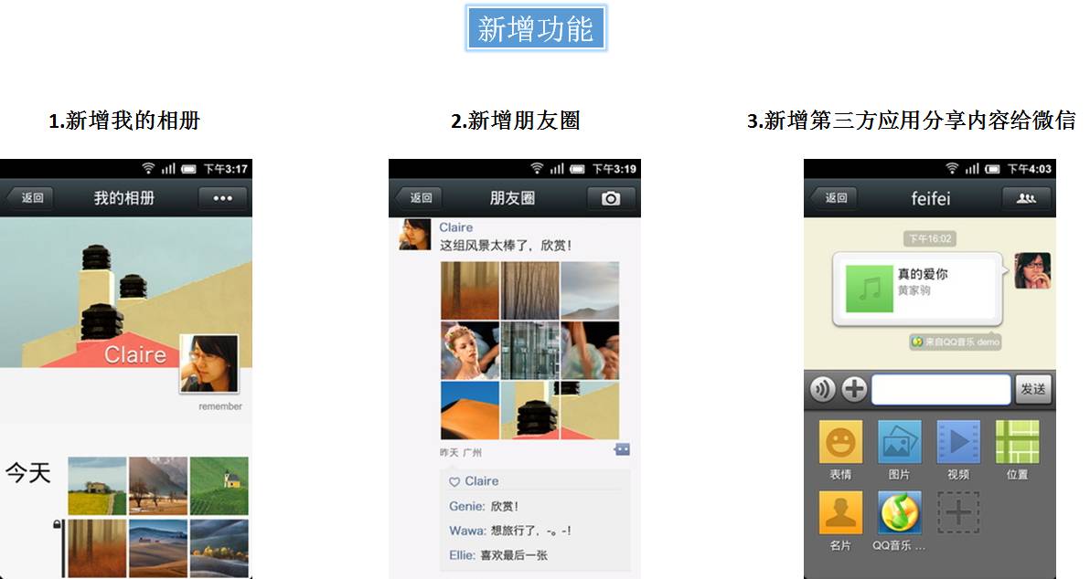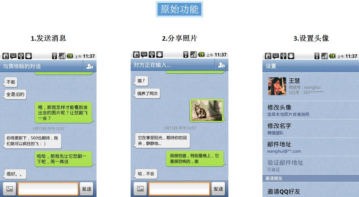 1.0的时候微信先上线照片分享功能,结合了手机移动端的功能,先把别具一格的特点展示给用户,再慢慢完善用户其他聊天习惯就可以理解。