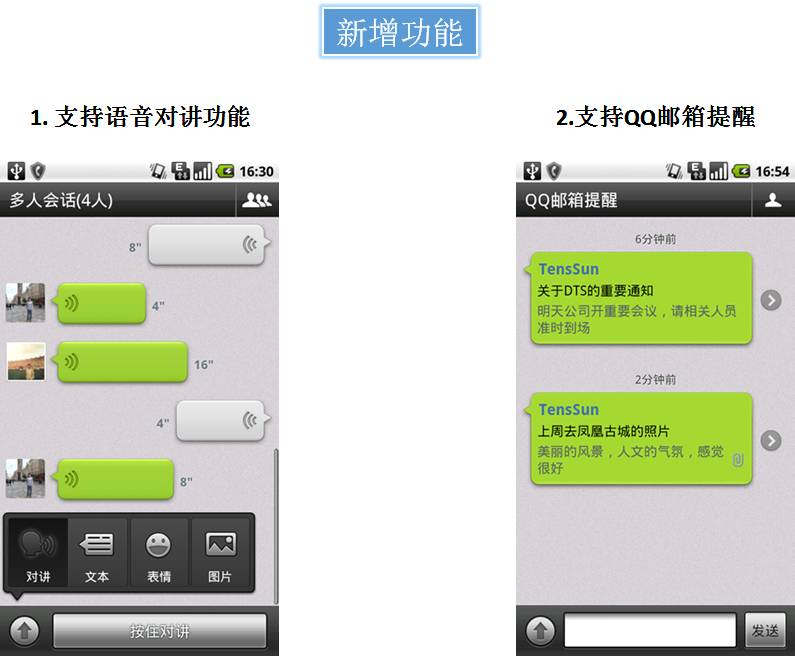 对语音功能的进一步优化,支持多人实时对讲及语音聊天。语音方面的进化从“语音消息”到“语音对讲”,随着技术的进步,最终实现“语音通话”。