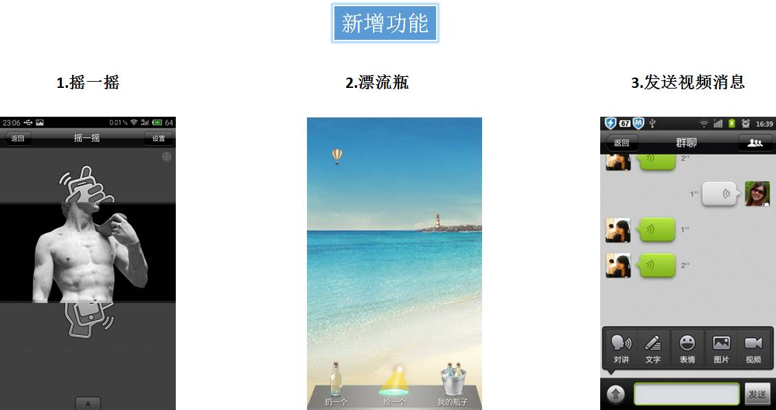 微信3.0上线了“摇一摇”“漂流瓶”“视频消息”三大功能,称得上是微信发展历程中又一座里程碑。