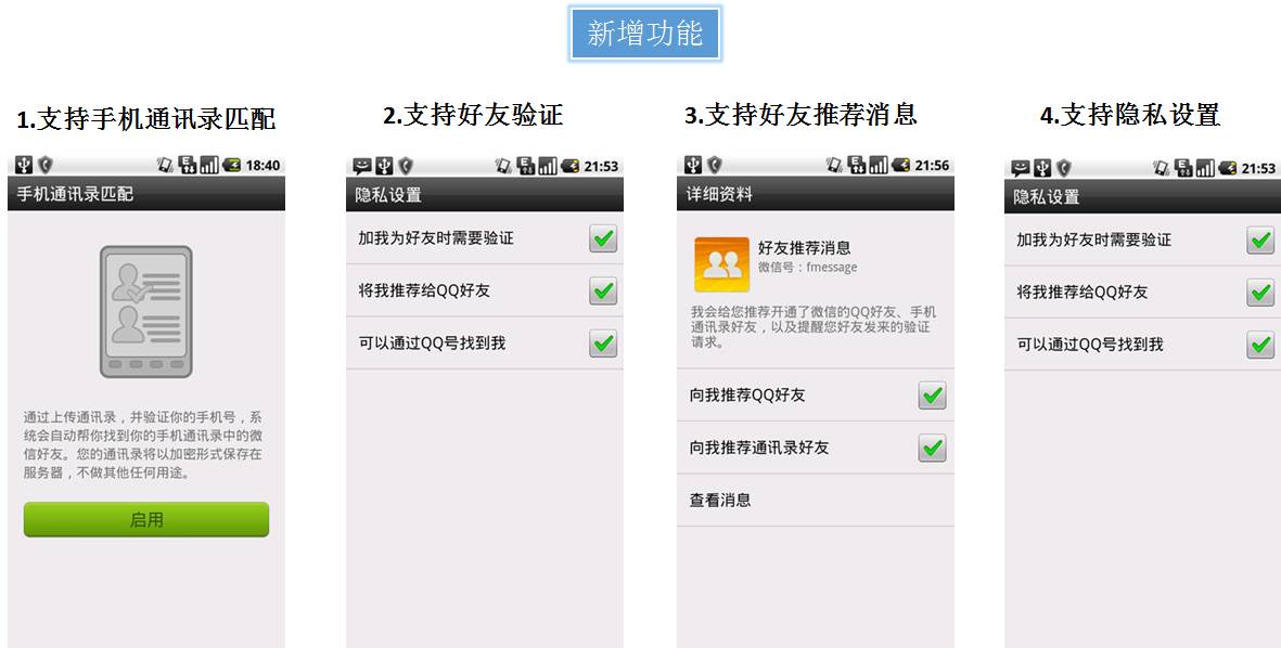 微信2.1版本,“手机通讯录”匹配功能开通,这一功能是和手机功能的又一结合,也打开了微信不同于QQ的独特用户引流渠道。