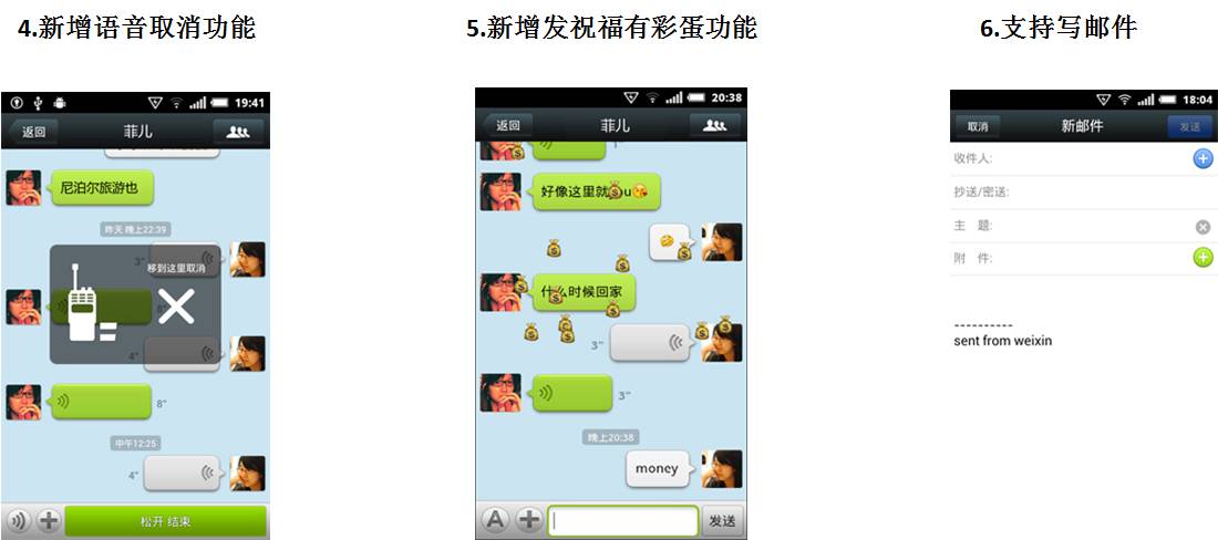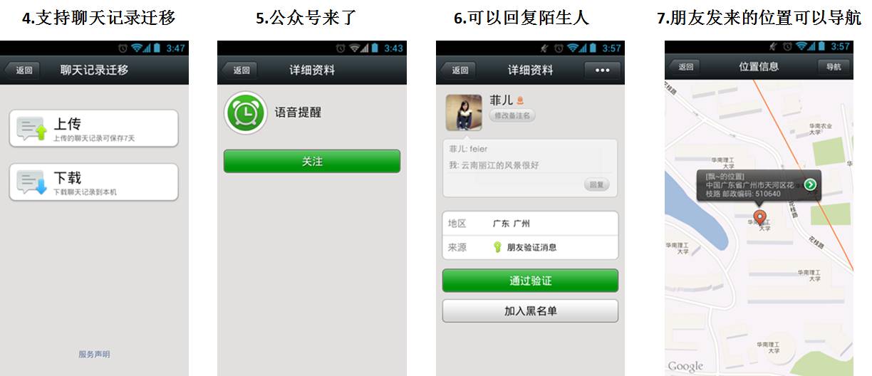 充分发挥了手机区别于PC的语音通话的功能特点,将用户聊天体验推向一个高潮。语音消息解放了双手,让“面对面”沟通的感觉更加明显。即使是不会打字的人群也可以通过语音消息实现沟通。降低了微信聊天的门槛,拓宽了用户人群。这一时间微信的用户量飞速增长。