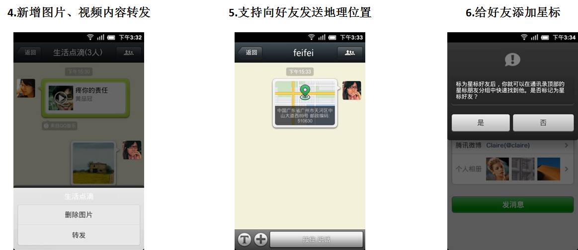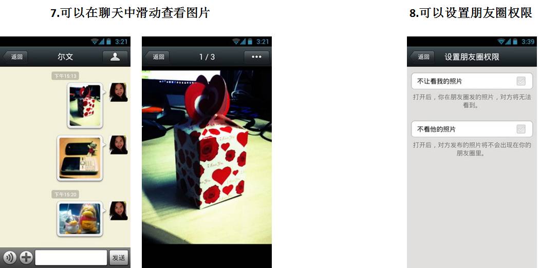 好在可以分享照片,用户可以把手机里的照片便捷的分享给好友。而且据用户分享,微信传输图片的速度比米聊要顺畅。这个功能就和手机拍照的功能结合起来,算是微信做移动应用的一个亮点。