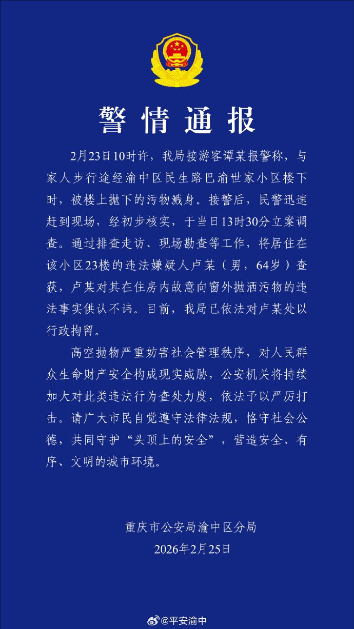 重庆市公安局渝中区分局2月25日发布警情通报:2月23日10时许,我局接游客谭某报警称,与家人步行途经渝中区民生路巴渝世家小区楼下时,被楼上抛下的污物溅身。接警后,民警迅速赶到现场,经初步核实,于当日13时30分立案调查。通过排查走访、现场勘查等工作,将居住在该小区23楼的违法嫌疑人卢某(男,64岁)查获,卢某对其在住房内故意向窗外抛洒污物的违法事实供认不讳。目前,我局已依法对卢某处以行政拘留。