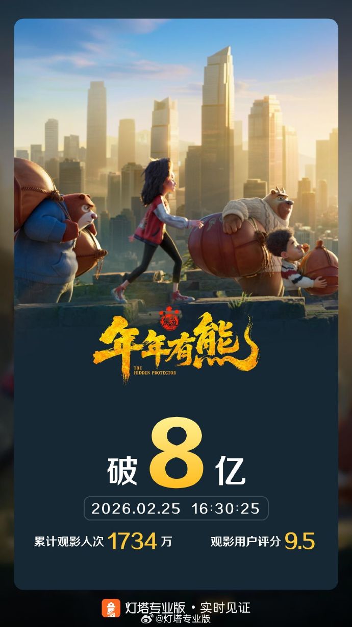 据灯塔专业版实时数据,截至2月25日16时30分,影片《熊出没·年年有熊》票房突破8亿。