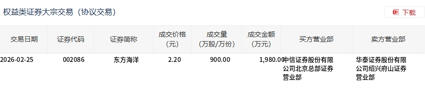 2月25日,东方海洋大宗交易成交900万股,成交额1980万元,占当日总成交额的13.59%,成交价2.2元,较市场收盘价2.32元折价5.17%。