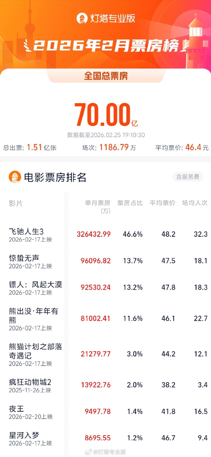 据灯塔专业版数据,截至2月25日,2026年2月总票房(含预售)破70亿。