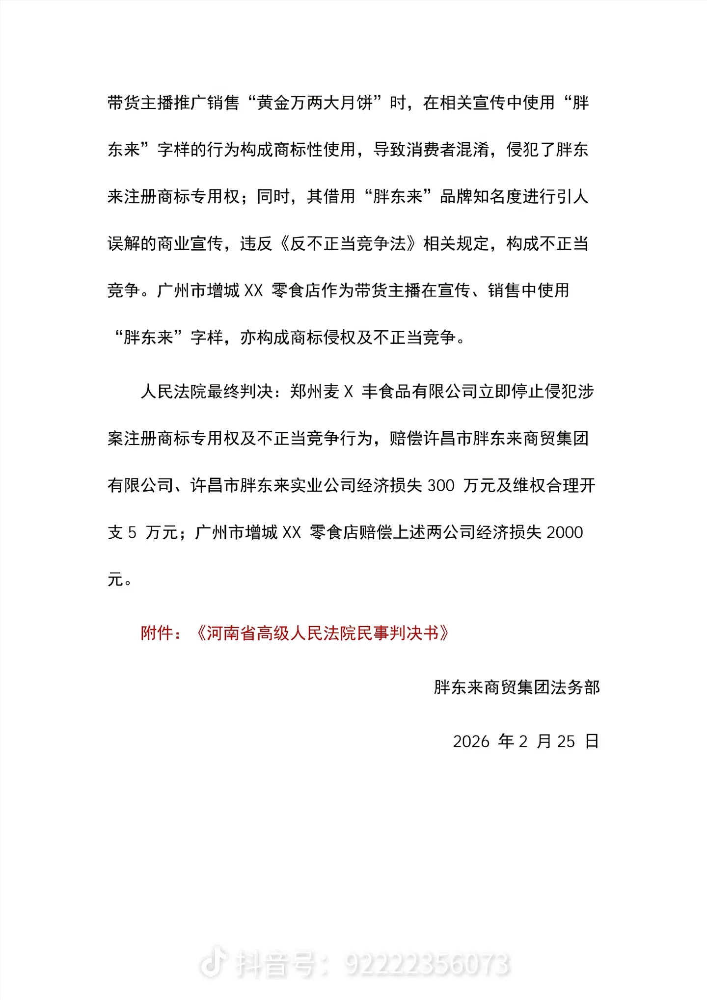 2月25日晚,胖东来官方账号发布关于“黄金万两大月饼”商标权及不正当竞争纠纷一案判决书公示,公示中提到,2024年以来,市面上出现由郑州麦X丰食品有限公司委托生产,宣传,销售的“黄金万两大月饼”,该产品通过以广州市增城XX零食店为代表的多平台带货主播宣传,销售,大量使用“胖东来”相关标识,字样,导致消费者混淆误认。胖东来发现该侵权行为后,立即进行取证,固定相关证据,并依法提起诉讼进行维权。