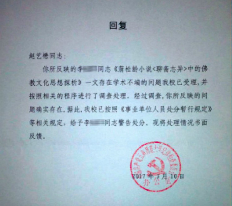 6月14日,微博名为“西选笑雪”的网友发布消息称,自己于2006年在云南师范大学所完成的本科毕业论文《论佛教对〈聊斋志异〉构建鬼狐仙怪世界的影响》竟遭同校副教授剽窃。该名李姓副教授将其毕业论文删减修改后,改名为《蒲松龄小说〈聊斋志异〉中的佛教文化思想探析》,并以个人名义发布在《云南电大学报》上。
