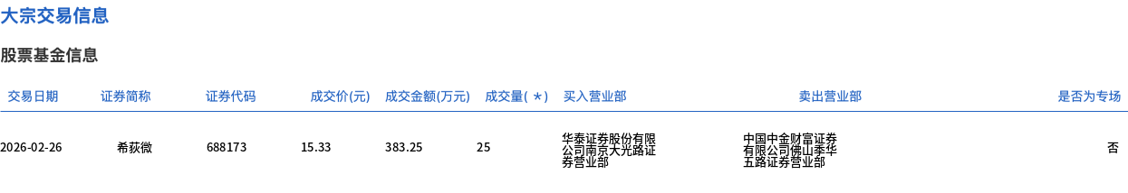 2月26日,希荻微大宗交易成交25万股,成交额383.25万元,占当日总成交额的2.63%,成交价15.33元,较市场收盘价16.93元折价9.45%。