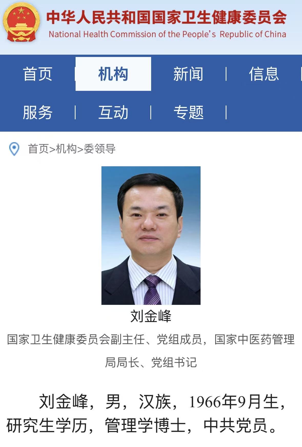 国家卫健委网站“委领导”一栏更新显示:刘金峰任国家卫生健康委员会副主任、党组成员,国家中医药管理局局长、党组书记。