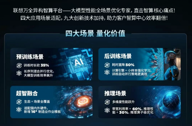 刘军透露,在国内市场联想已经构筑起3大差异化竞争优势。第一,韧性、敏捷的供应链和卓越的全球化运营,将助力联想中国区AI基础设施在下一阶段处于独特的领先地位,未来联想与上下游伙伴的合作将更加深入。第二,统一调度和纳管多元异构算力的能力,他以联想万全异构智算平台为例表示,该平台可以使大模型预训练时间缩短35%、后训练时间缩短50%、推理性能提升30%。第三则是领先行业和经过实践验证的液冷技术。联想海神液冷技术散热效率达98%,并能实现90%的余热回收再利用,降低42%的能耗,数据中心PUE可降至1.1。同时,联想已经积累了大量先进的液冷数据中心建设经验,其中高性能计算连续十几年位居全球HPC Top500第一。