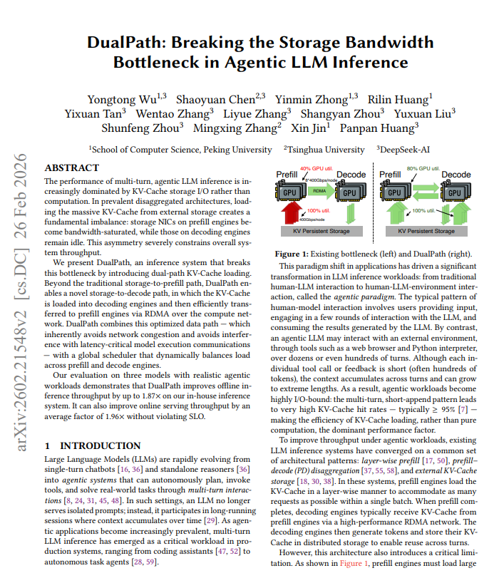 近日,DeepSeek团队联合清华大学、北京大学计算机学院发表名为《DualPath:突破智能体LLM推理中的存储带宽瓶颈》的论文。针对智能体LLM推理中的KV-Cache存储瓶颈,论文提出DualPath系统。该系统打破传统单一存储到预填充路径,引入创新的存储到解码路径,利用闲置带宽并配合全局动态调度。实验显示,其在线推理吞吐量平均提升达1.96倍。