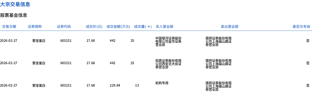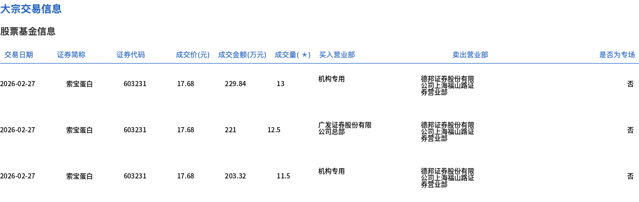 2月27日,索宝蛋白大宗交易成交100万股,成交额1768万元,占当日总成交额的36.92%,成交价17.68元,较市场收盘价19.22元折价8.01%。