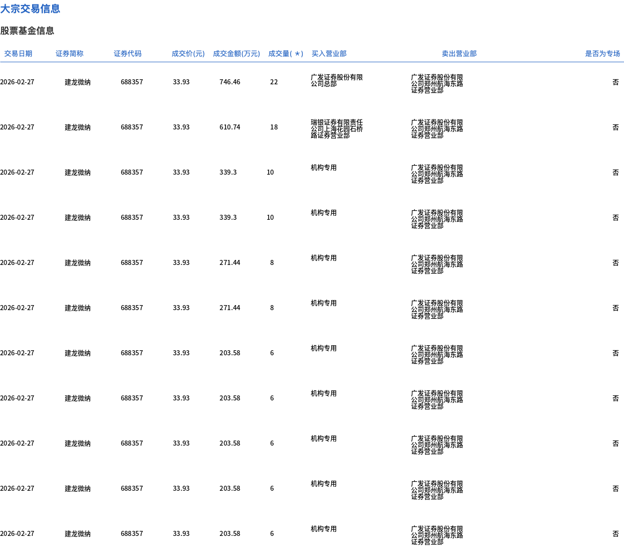 2月27日,建龙微纳大宗交易成交106万股,成交额3596.58万元,占当日总成交额的30.7%,成交价33.93元,较市场收盘价36.88元折价8%。